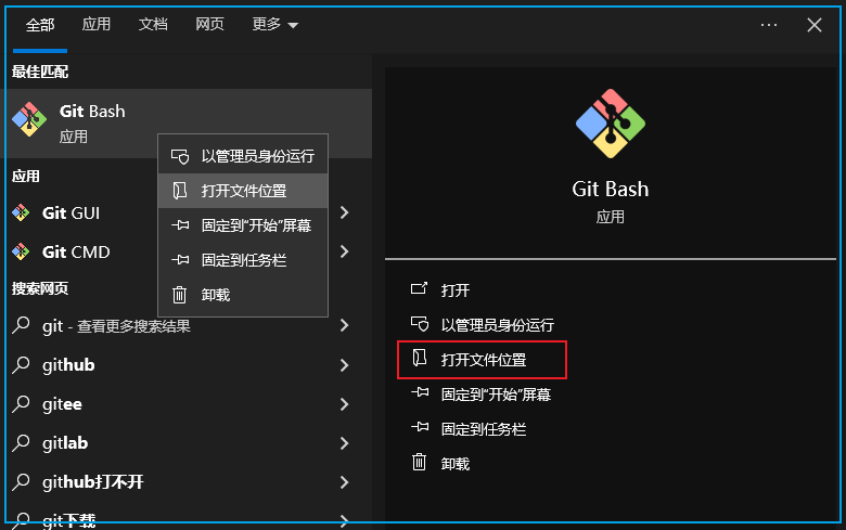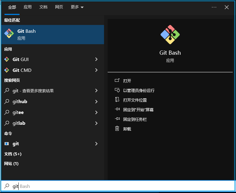 Win10 在开始菜单中输入 git 可以快速匹配 Git Bash 应用,如果想更快打开指定应用,需要在应用的快捷方式中设置快捷键。