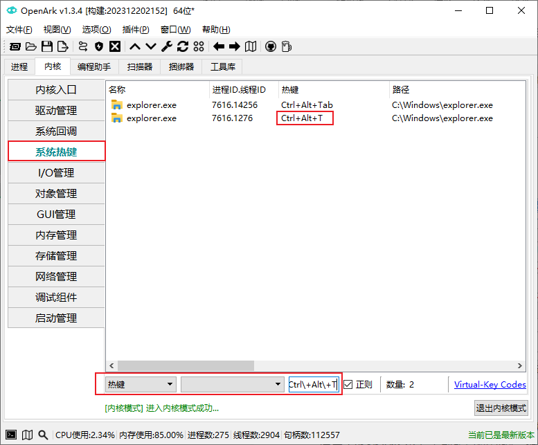 需要注意的是,查看系统快捷键需要管理员权限和内核权限,使用前要以管理员权限运行程序,OpenArk 程序右下角有一个按钮“进入内核模式”。