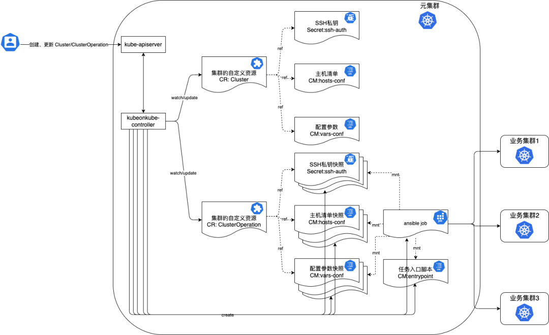 kubeonkube-controller 需要运行在一个已存在的 Kubernetes 集群,通过应用 kubeonkube-controller 提供的标准 CRD 资源和 Kubernetes 内建资源来控制和管理集群的生命周期(安装、卸载、升级、扩容、缩容等)。kubeonkube-controller 采用 ansible-playbook 作为底层技术依赖,一方面简化了集群部署的操作流程,降低了用户的使用门槛。另一方面在 ansibel-playbook 能力基础上增加了集群操作记录等。