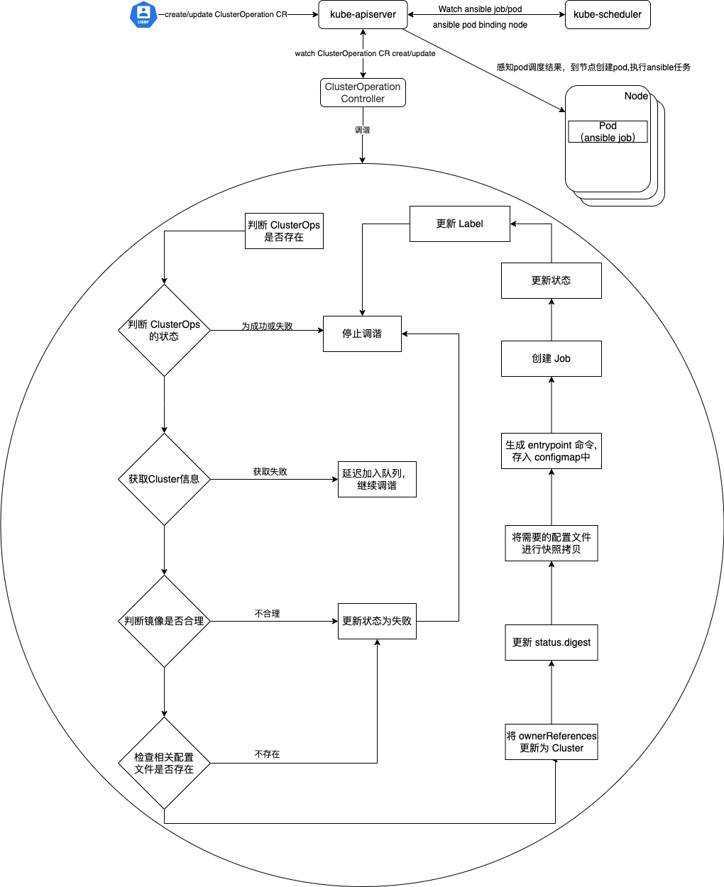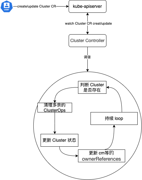 判断 Cluster 是否存在 判断是否有多余的 Cluster Operation 对象需要清理 更行 Cluster 状态,记录 Cluster Operator 的执行情况 更新 hosts-conf vars-conf ssh-auth 的 ownerReferences 变为当前 Cluster 信息 循环监听,当有新的 ClusterOps 任务进来后,继续记录 Cluster Operator 的执行情况等