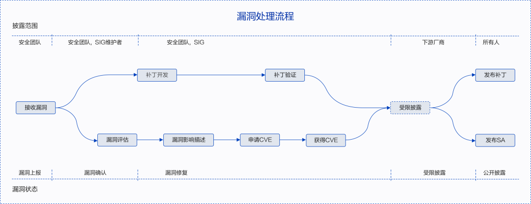 每一个安全漏洞都会有一个指定的人员进行跟踪和处理,协调员是 openEuler 安全委员会的成员,他将负责跟踪和推动漏洞的修复和披露。漏洞端到端的处理流程如下图。