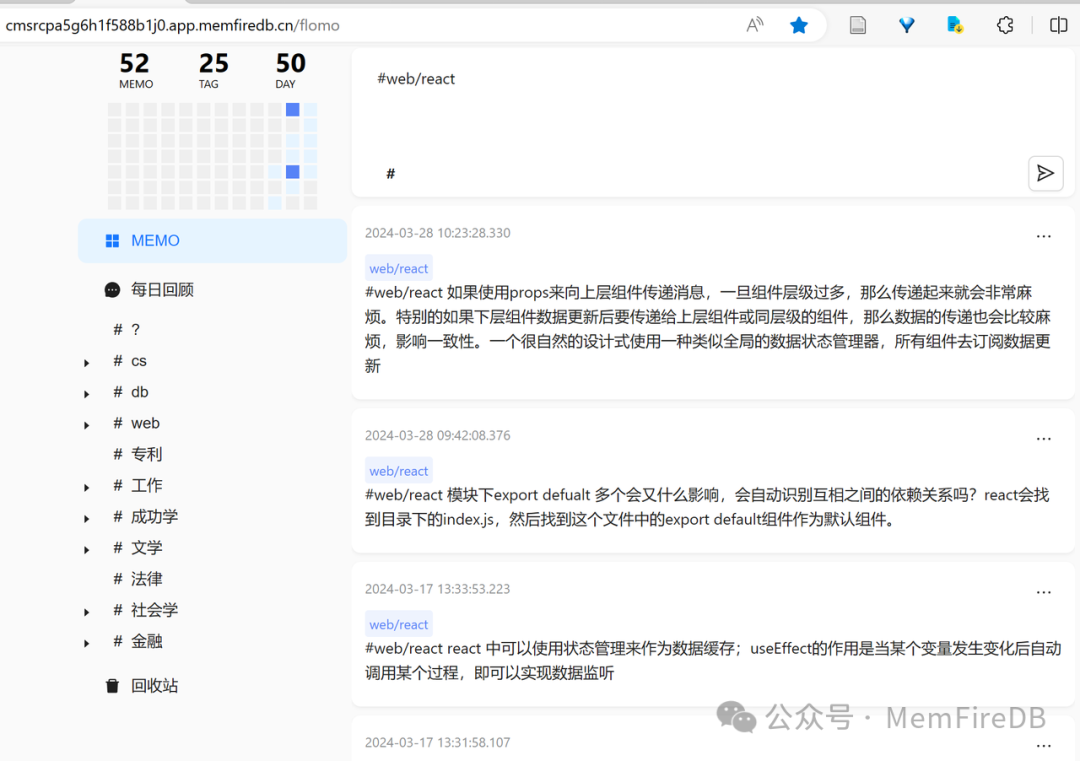 我就用MemFire Cloud构建并托管了一个类似Flomo的web应用(http://cmsrcpa5g6h1f588b1j0.app.memfiredb.cn/),这个应用其实是一个思绪整理工具。这个应用目前的主要功能是: