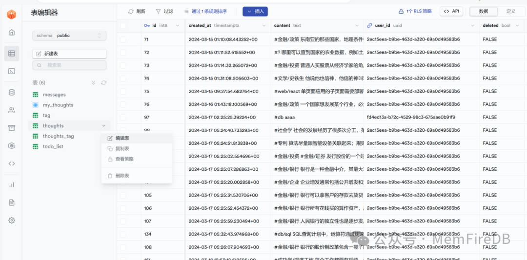 数据库定义直接使用MemFire Cloud的数据库编辑页面进行