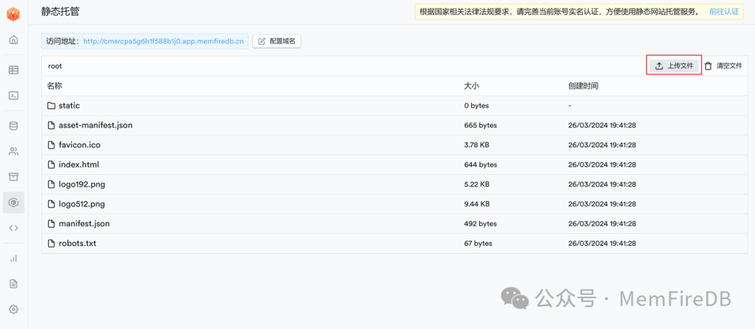 网站开发好了,需要将其发布到线上,也是很简单,直接将React打包并压缩成ZIP文件,上传到MemFire Cloud即可访问在线网站了。