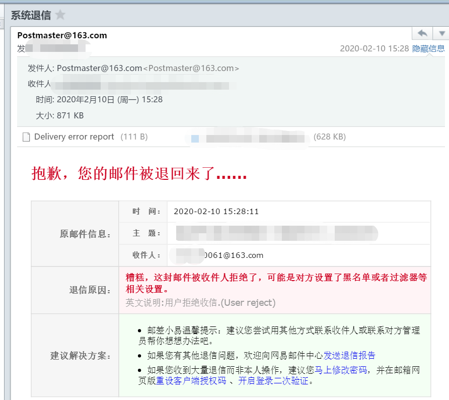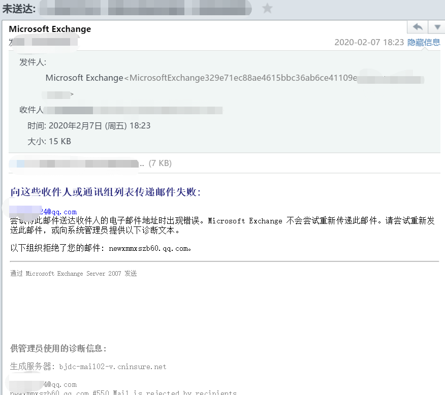 由于查询了好久没有方法可以直接判断邮件发送状态所以我只能用我所遇到的退信格式来判断了,如下图(公司生产邮箱内容所以打码了,不同收件邮箱退信格式不同,渣浪的邮箱投递不成功没有退信)