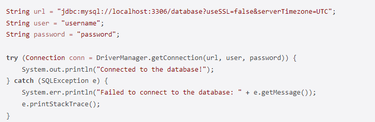 String url = "jdbc:mysql://localhost:3306/database?useSSL=false&serverTimezone=UTC";String user = "username";String password = "password";try (Connection conn = DriverManager.getConnection(url, user, password)) {System.out.println("Connected to the database!");} catch (SQLException e) {System.err.println("Failed to connect to the database: " + e.getMessage());e.printStackTrace();}