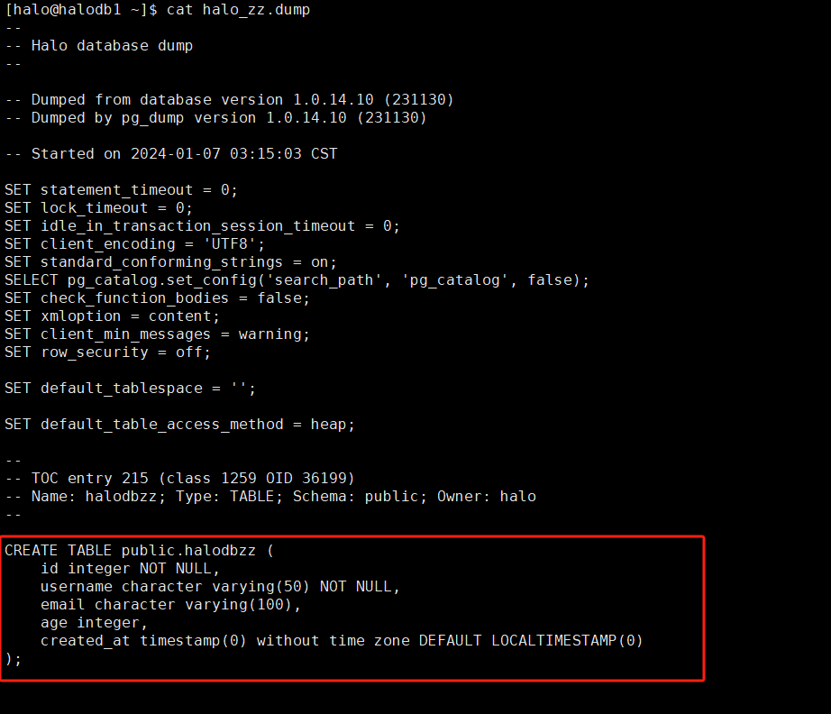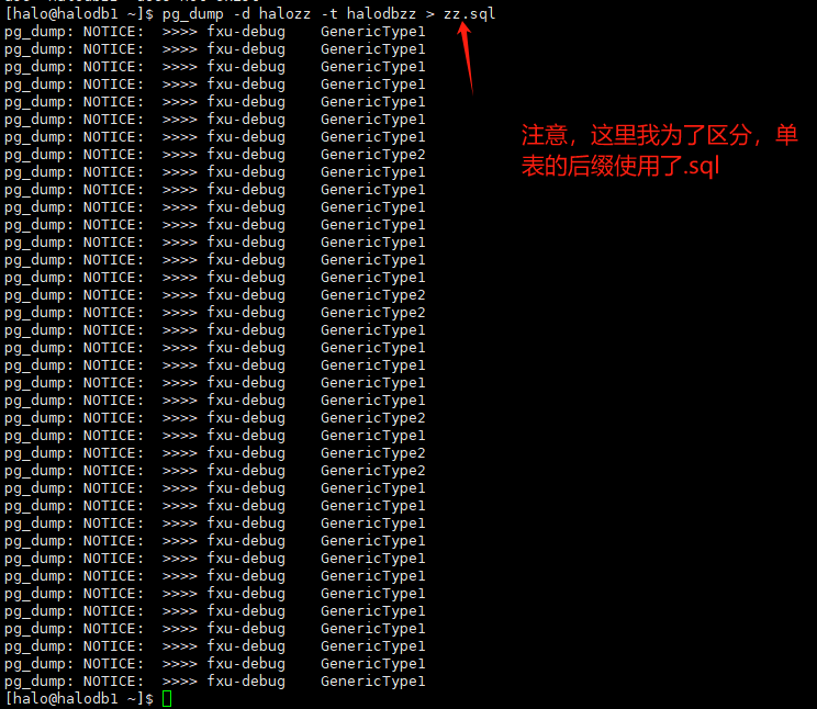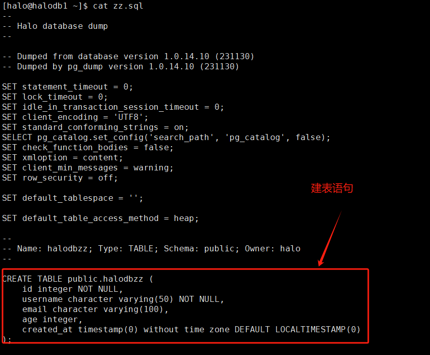 [halo@halodb1 ~]$ pg_dump -d halozz -t halodbzz > zz.sql