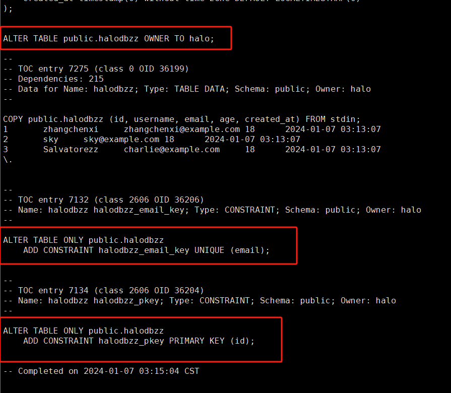 我们仔细观察可以发现,数据采用了COPY方式,当然也可以导出为INSERT,需要在pg_dump命令中加上—inserts指令。如果不是用于跨平台的数据迁移,建议还是使用COPY,该方式拥有更高的性能。当然逻辑备份也支持只对部分表进行备份,这也是逻辑备份的优点之一。下面用一个小例子来展示下,就备份我刚才所创建的测试表halodbzz。