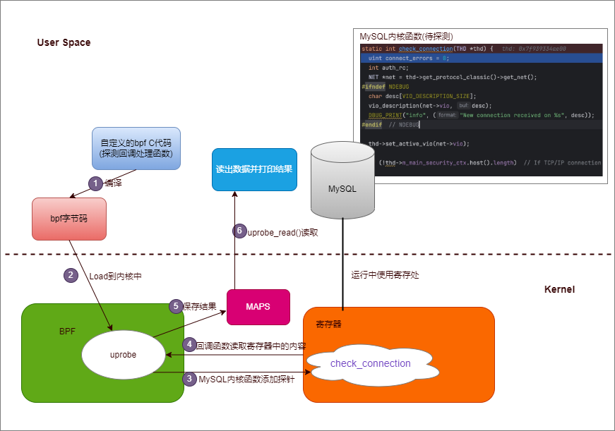 接下来我们将基于BCC的uprobe,写一个eBPF程序,观测MySQL上是否存在大量短连接。