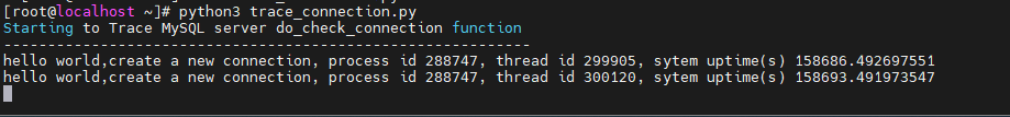 # output trace result.print("Starting to Trace MySQL server do_check_connection function")print("------------------------------------------------------------")//定义打印的回调函数def print_event(cpu, data, size):event = b["events"].event(data)decoded_string = event.info.decode('utf-8')print("%-35s, process id %-6s, thread id %-6s, sytem uptime(s) %-14s" % (decoded_string,event.tgid, event.pid,event.ts/1000000000))//open_perf_buffer 将打印的回调函数注册到 events 表中b["events"].open_perf_buffer(print_event)while 1:try:b.perf_buffer_poll()except KeyboardInterrupt:exit()