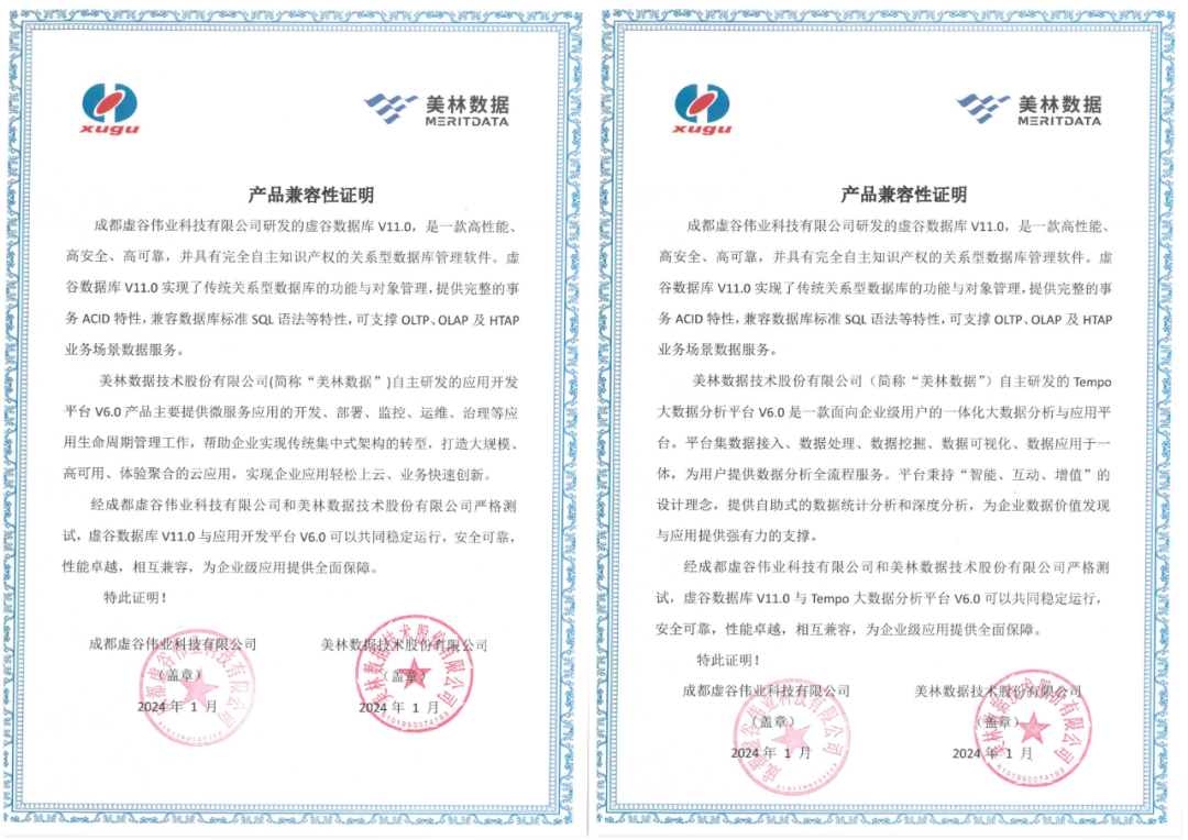本次测试中,虚谷旗下的虚谷数据库V11.0、V12.0 与美林数据旗下的应用开发平台V6.0、Tempo大数据分析平台V6.0、Tempo指标平台(TempoEM)V6.0、Tempo人工智能平台(TempoAI)V6.0、Tempo数据工厂平台(TempoDF)V6.0、Tempo商业智能平台(TempoBI)V6.0适配成功,双方产品相互兼容良好体验良好,系统功能运行稳定,满足了用户功能、性能和可靠性要求,可为企业级应用提供全面的数据服务及安全保障。