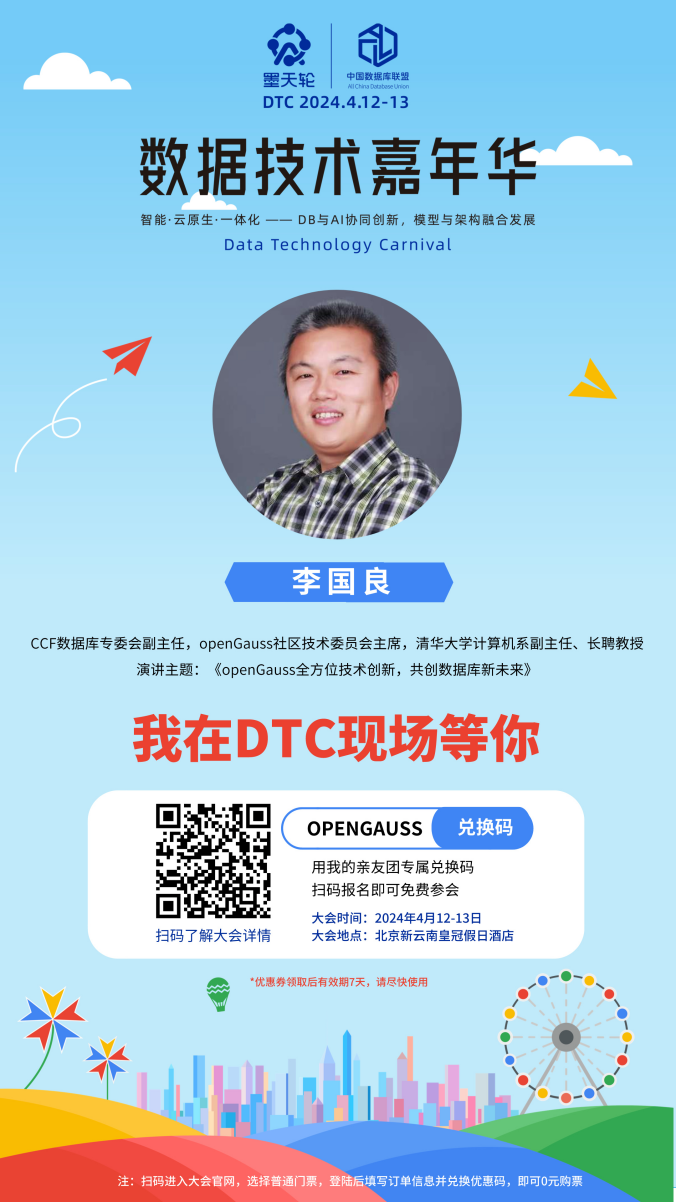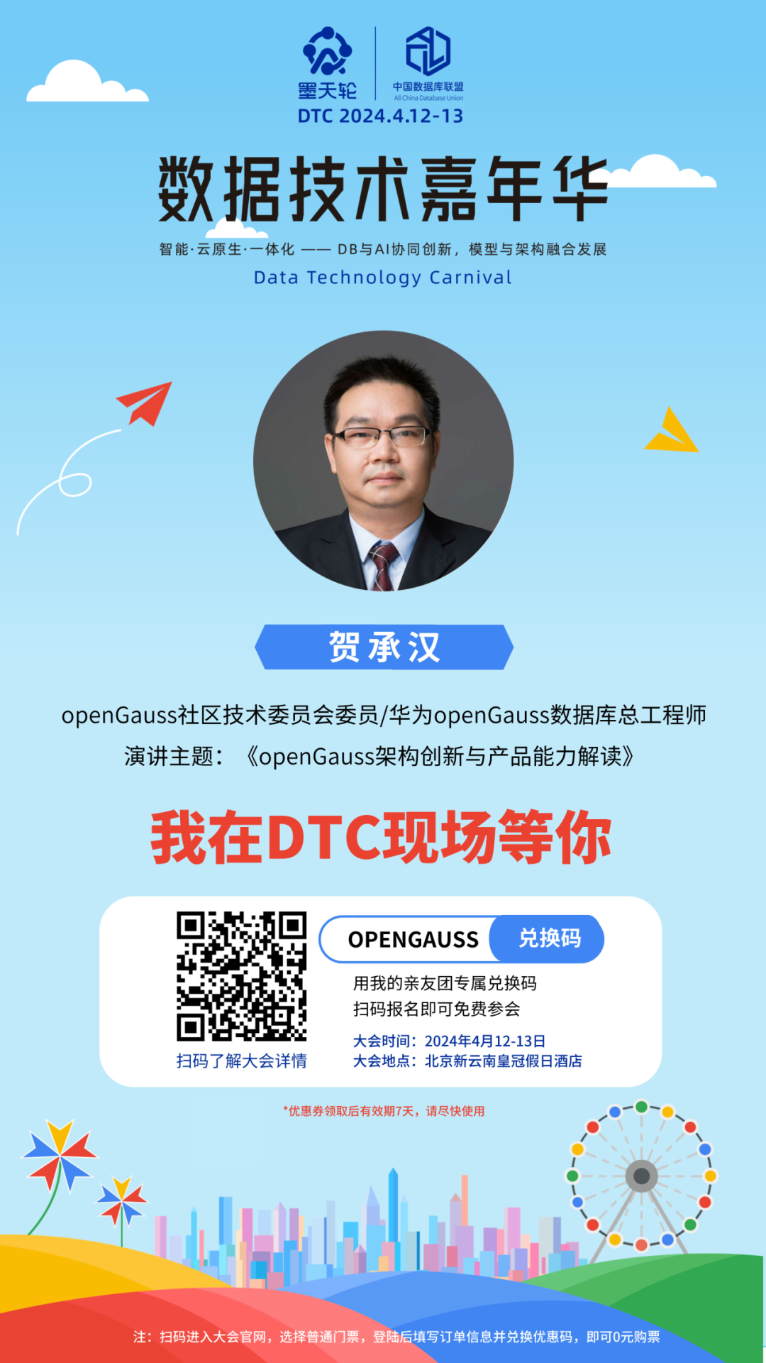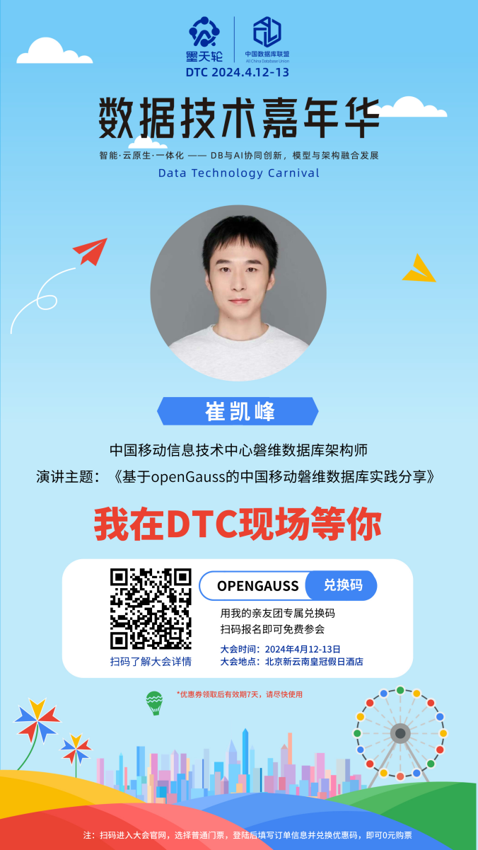 由中国DBA联盟和墨天轮社区共同主办的第十三届数据技术嘉年华(DTC 2024)将于4月11-12日在北京新云南皇冠假日酒店举办。openGauss深度参与其中,三位重量级技术专家和中国移动用户代表,分别在主论坛和三个专题论坛发表演讲,为大家分享openGauss开源数据库内核能力、架构创新、创新特性和落地实践成果,精彩内容抢先了解,文末还有免费参会福利哦!