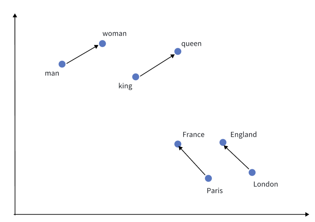 Word2vec 模型可用来映射每个词到一个向量,可用来表示词对词之间的关系。下图是展示一个 2 维的向量空间的例子(实际可能是比较高的维度)。