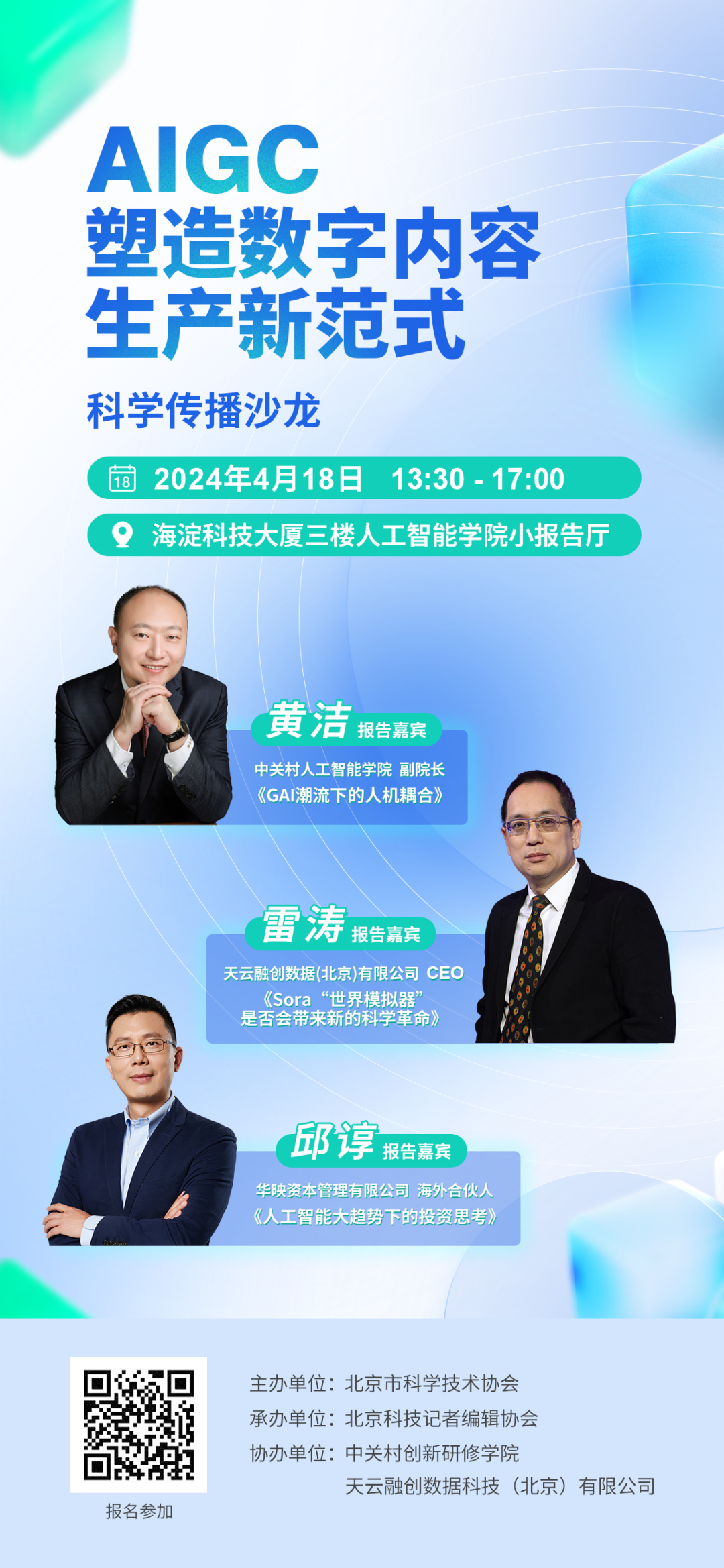 4月18日,由北京市科协主办,北京科技记协承办的“AIGC塑造数字内容生产新范式”科学传播沙龙活动将在中关村创新研修学院举办。本次科学传播沙龙设置有主题报告、自由交流以及海淀城市大脑展厅运营指挥中心参观学习三个环节。沙龙将从政府建设、产业落地、市场投资三个维度进行主题分享。