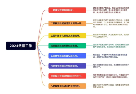 2024年,国家数据局将从健全数据基础制度、提升数据资源开发利用水平、以数字化赋能高质量发展、促进数据科技创新发展、优化数据基础设施布局、强化数据安全保障能力、提升数据领域国际合作水平和发挥试点试验的引领作用等8方面推动数据工作。