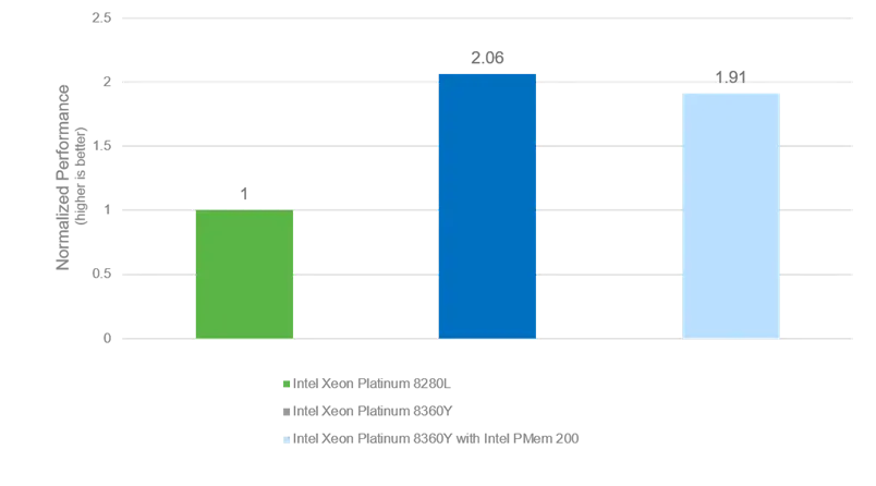 从上图我们能够看出,相比与上一代平台,Ice Lake平台配置两2TB DRAM内存的结果,AntDB数据库的性能提升了2倍多。右侧结果相比中间的纯DRAM内存略有下降,但考虑到傲腾TM持久内存的成本优势,这个配置可以使硬件系统的TCO成本显著降低。