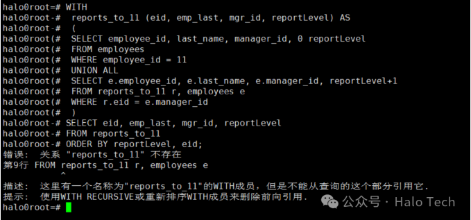 处理不确定深度的层级结构,比如组织机构,一个常用的设计是在一张表里面保存 ID 和 Parent_ID ,并且通过自连接的办法构造一棵树。这种方式对写数据的过程很友好,但是查询过程就变得相对复杂。Halo数据库提供了WITH语句,允许构造用于查询的辅助语句。这些语句通常称为公共表表达式(Common Table Expressions)cte。cte类似于只在查询执行期间存在的临时表。递归查询是指递归CTE的查询。