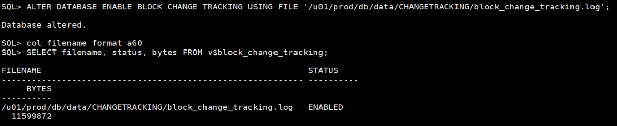 SQL> ALTER DATABASE ENABLE BLOCK CHANGE TRACKING USING FILE '+DATA';