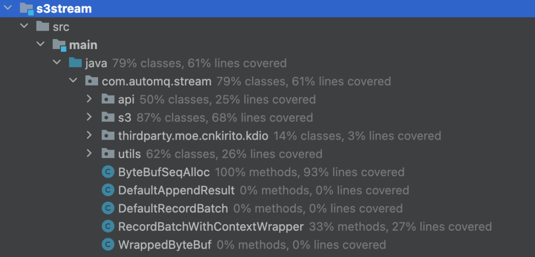 单元测试是所有模块的必选项,在单元测试需要 Mock Everything 来进行测试,依赖的组件库包括 JUnit、Mockito、Awaitility[3]等。以 AutoMQ 的核心模块 S3Stream 为例,目前单测有 80% 左右的类覆盖率,60%+ 的行覆盖率,后续也会持续提升。