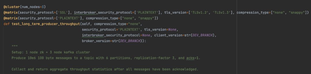 得益于 AutoMQ 的存算分离架构,我们复用了 Apache Kafka 全部的计算层代码,100% 的兼容性让 AutoMQ 可以充分利用 Apache Kafka 的 E2E 测试基础设施。Kafka 使用了一种矩阵式的测试方法,能够支持一个测试用例跑在不同的 Kafka 集群规模,甚至不同的集群配置下,能够放大每一个测试用例的价值。如下述的一个 Producer 吞吐量相关的测试用例,将跑在一个具备 5 个节点的集群上,有两个矩阵,第一个矩阵将提供 4 种不同的集群配置组合,第二个矩阵提供 2 种组合,该用例一共会跑在 6 种场景下。