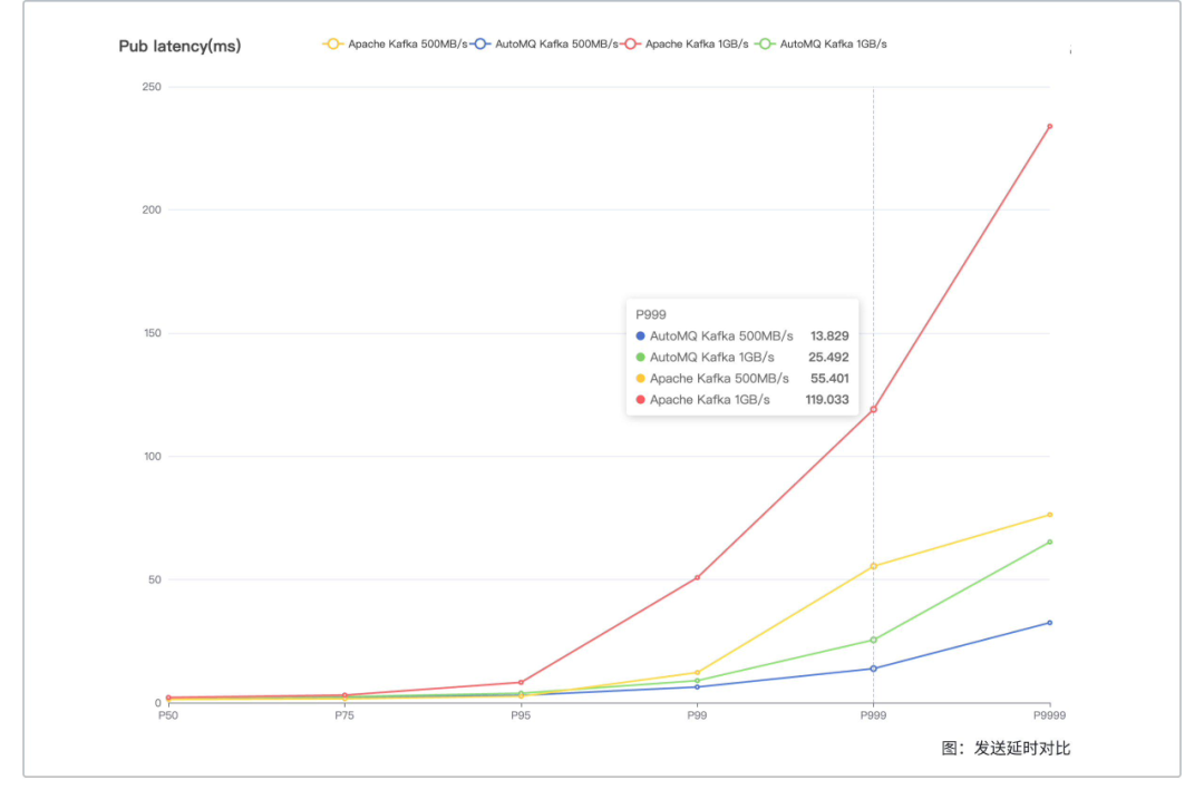 作为一款数据密集型软件,吞吐和延迟这些性能指标都是至关重要的。AutoMQ 通过 OpenMessaging Benchmark 框架[5] 进行测试,也用于与其他产品进行技术指标的对比,如下图所示是 AutoMQ 在特定流量模型下的延迟指标对比图,更多的 AutoMQ 技术指标详见性能白皮书 [6]。