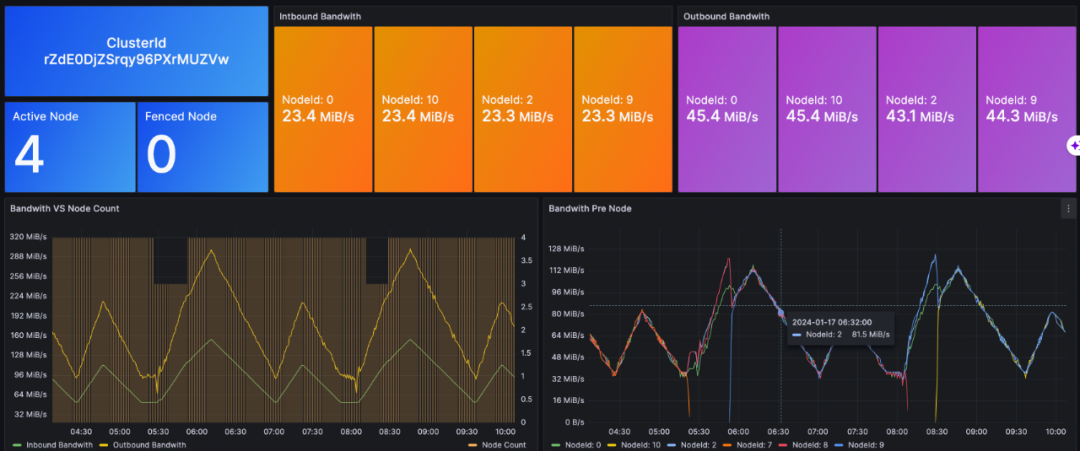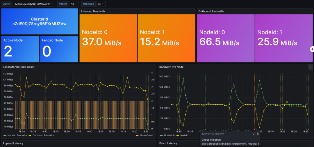 如上图所示,图中相邻的两根竖虚线表示一次故障注入的开始和结束,我们可以很容易发现,在上述两个节点的集群中,一个节点出现故障时,流量会持续跌到 0,然后分区会通过故障转移挪动到另一个节点,所以另一个节点出现了持续的流量上涨。在故障结束后,AutoBalancing 组件又会重新调度分区,将流量尽可能调度到比较均衡的状态。