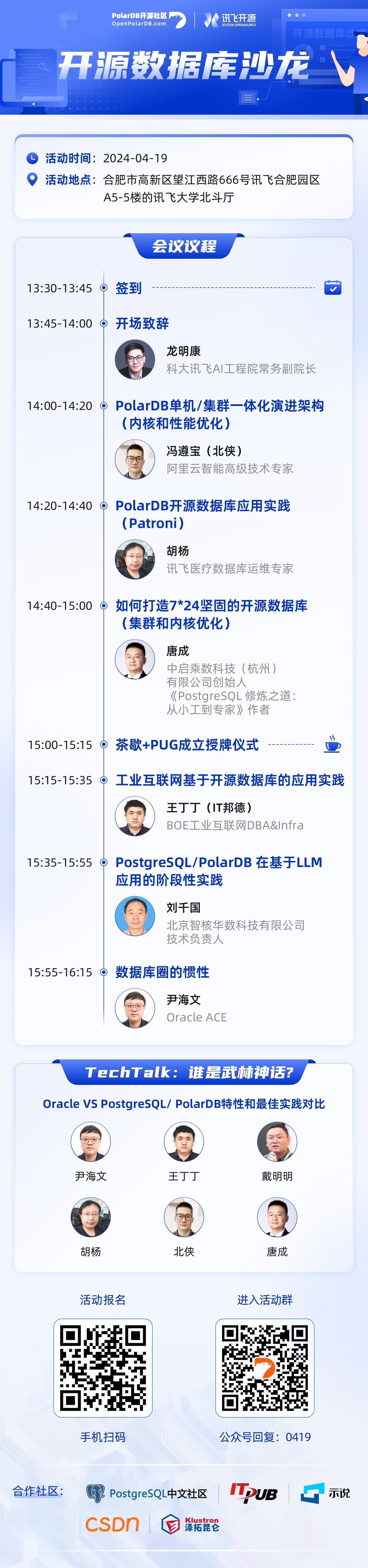 4月19日周五,PolarDB开源社区联合科大讯飞共同举办开源数据库技术沙龙,本次沙龙我们邀请了众多数据库领域的专家,与广大数据库开发者和爱好者们进行技术交流与分享。