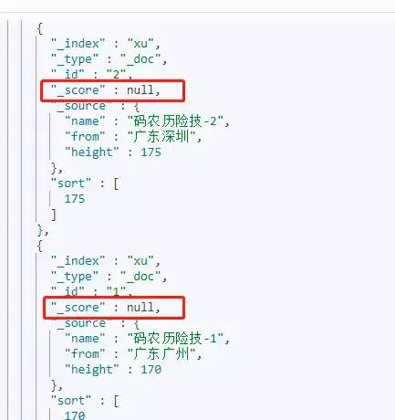这里注意一下,我们加了排序条件之后,"_score"字段就是null值了,因为我们已经把ElasticSearch默认的打分规则(TF-IDF原理)给破坏掉了,这样就能够按照我们制定的排序规则来排序。