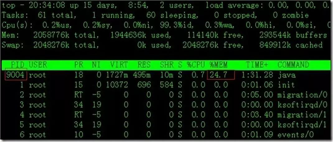 通过top命令,发现PID为9004的Java进程一直占用比较高的内存不释放(24.7%),出现高内存占用的故障。