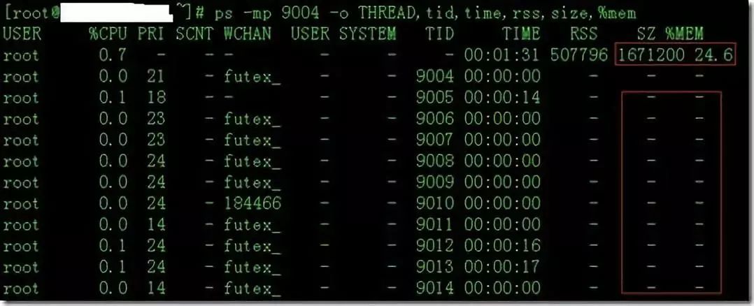 ps -mp 9004 -o THREAD,tid,time,rss,size,%mem