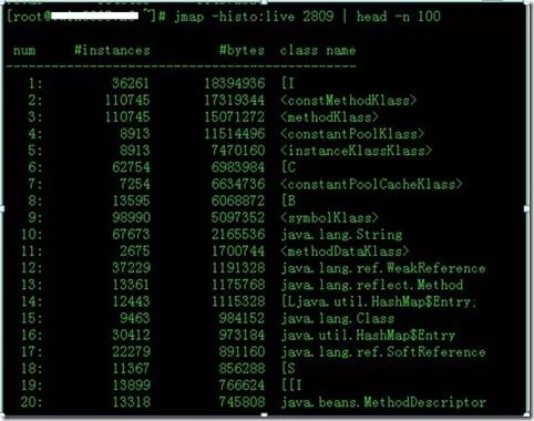 等不及了,下面我们使用jmap -histo:live [pid] 命令把高内存占用的妖孽揪出来: