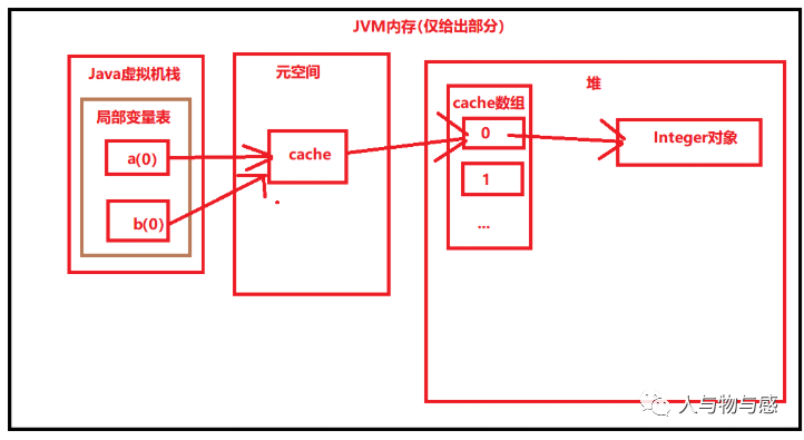 在我们在类中定义b时,实际上这个b存于堆中,然后指向常量池中的cache,然后cache又指向在堆中的数组,而数组的每一项均指向了堆中的Integer对象,所以可以直接说是b直接指向了0这个Integer对象,在类中定义的a,其引用存在于局部变量表中,引用指向了Integer的cache,cache指向了堆,所以它们两个的实际地址引用是一致的,都是cache在堆中的缓存