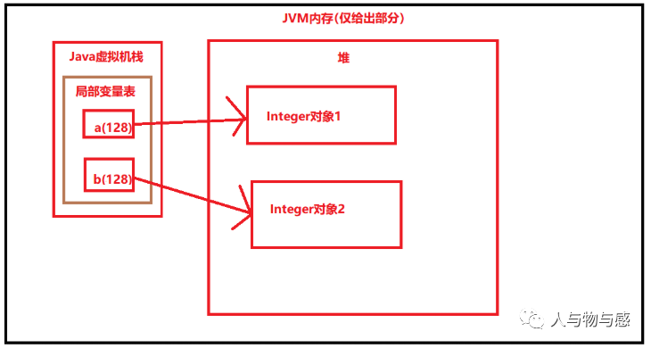 这里由于128不属于缓存范围,所以两个语句分别建立了两个不同的对象,所以他们的内存地址也是不一样的,所以返回false,同样也给出一个草图