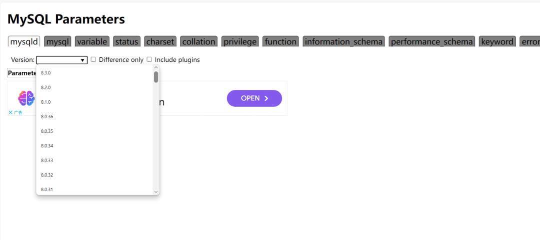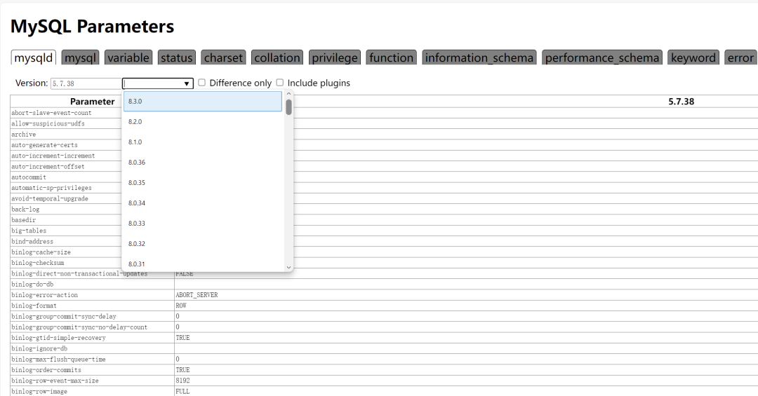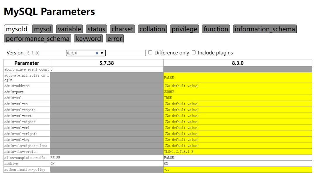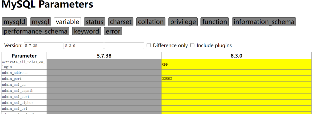 从5.7升级至8.0的时候,需要确认两个版本中存在的差异,特别是关于参数的对比,开发人员和运维人员,可以检查现有的应用程序或脚本中是否存在不兼容的参数,在这里为大家提供一个非常有用的链接,可以利用它进行对比参数。
