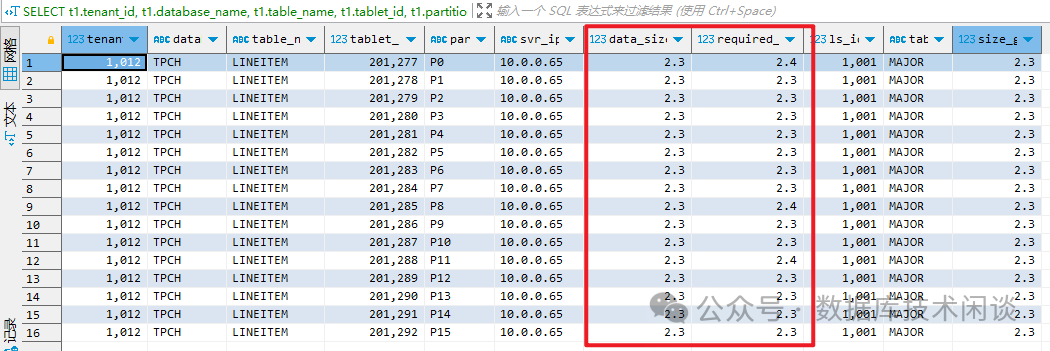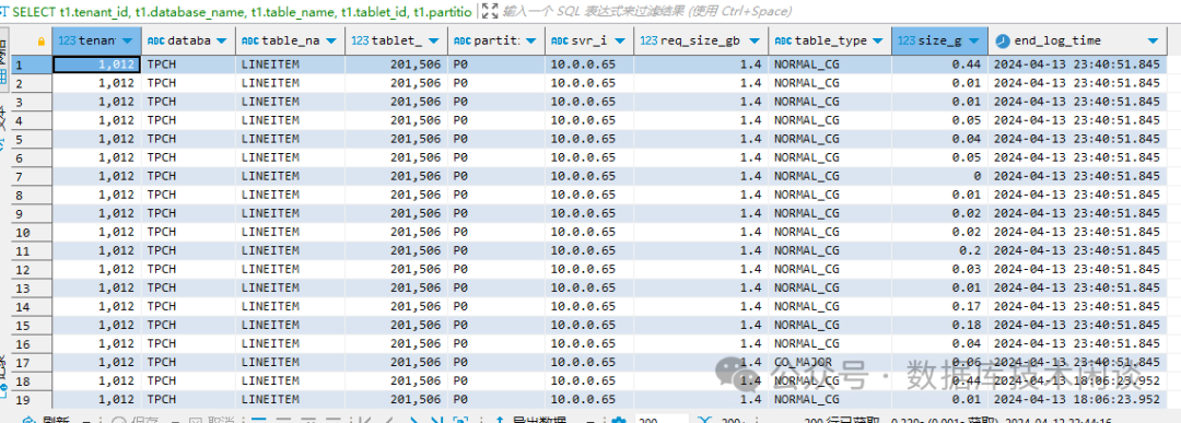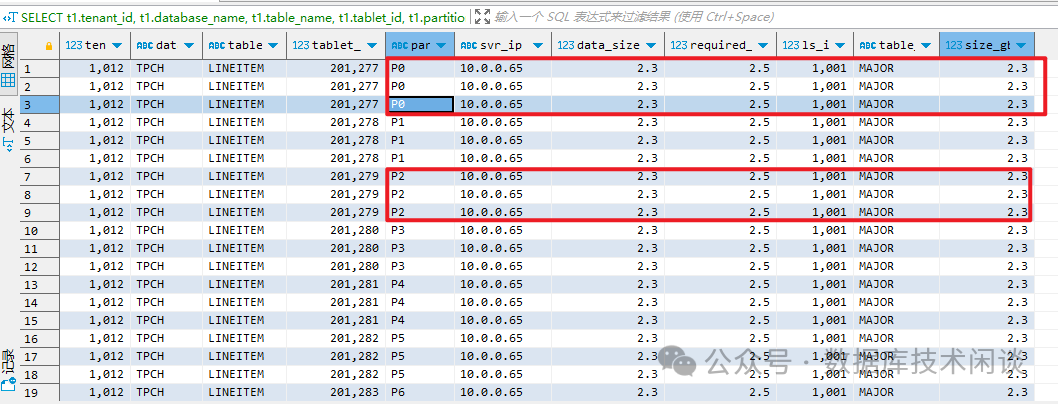 SELECT t1.tenant_id, t1.database_name, t1.table_name, t1.tablet_id, t1.partition_name, t1.svr_ip, round(t2.data_size/1024/1024/1024,1) data_size_gb, round(t2.required_size/1024/1024/1024,1) required_size_gb, t1.ls_id, s.table_type, round(s.SIZE/1024/1024/1024,2) size_gbFROM oceanbase.CDB_OB_TABLE_LOCATIONS t1JOIN oceanbase.cdb_ob_tablet_replicas t2 ON (t1.tablet_id=t2.tablet_id AND t1.ls_id=t2.ls_id)JOIN oceanbase.GV$OB_SSTABLES s ON (t1.tenant_id=s.tenant_id AND t1.ls_id=s.ls_id AND t1.svr_ip=s.svr_ip AND t1.tablet_id=s.tablet_id)WHERE t1.tenant_id=1012 AND t1.database_name='TPCH' AND t1.ROLE='LEADER' AND s.table_type <> 'MEMTABLE' AND table_name IN ('lineitem');