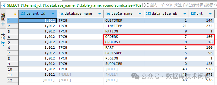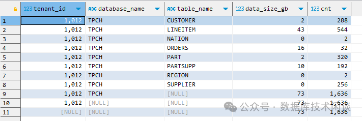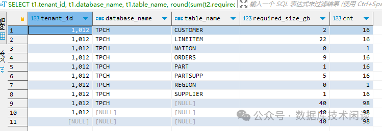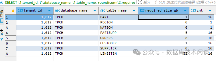 SELECT t1.tenant_id, t1.database_name, t1.table_name, round(sum(t2.required_size)/1024/1024/1024) required_size_gb, count(*) cntFROM oceanbase.CDB_OB_TABLE_LOCATIONS t1JOIN oceanbase.cdb_ob_tablet_replicas t2 ON (t1.tablet_id=t2.tablet_id AND t1.ls_id=t2.ls_id)WHERE t1.tenant_id=1012 AND t1.database_name='TPCH' AND t1.ROLE='LEADER'GROUP BY t1.tenant_id, t1.database_name, t1.table_name;SELECT t1.tenant_id, t1.database_name, t1.table_name, round(sum(s.size)/1024/1024/1024) data_size_gb, count(*) cntFROM oceanbase.CDB_OB_TABLE_LOCATIONS t1JOIN oceanbase.cdb_ob_tablet_replicas t2 ON (t1.tablet_id=t2.tablet_id AND t1.ls_id=t2.ls_id)JOIN oceanbase.GV$OB_SSTABLES s ON (t1.tenant_id=s.tenant_id AND t1.ls_id=s.ls_id AND t1.svr_ip=s.svr_ip AND t1.tablet_id=s.tablet_id)WHERE t1.tenant_id=1012 AND t1.database_name='TPCH' AND t1.ROLE='LEADER' AND s.table_type <> 'MEMTABLE'GROUP BY t1.tenant_id, t1.database_name, t1.table_name;
