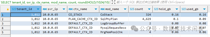 ALTER SYSTEM flush kvcache;SELECT tenant_id, svr_ip, ctx_name, mod_name, count, round(HOLD/1024/1024/1024,2) hold_gb, round(used/1024/1024/1024,2) used_gbFROM oceanbase.gv$ob_memoryWHERE tenant_id=1012ORDER BY HOLD DESC LIMIT 5;