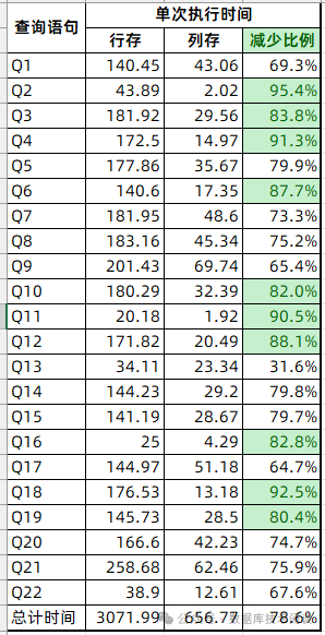 可以看到 22 个查询的执行时间都明显减少,总时间减少 78% 。列存下 TPC-H 的复杂查询性能提升非常明显!