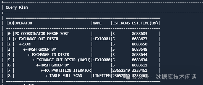 ===========================================================================|ID|OPERATOR |NAME |EST.ROWS |EST.TIME(us)|---------------------------------------------------------------------------|0 |PX COORDINATOR MERGE SORT | |5 |9829316 ||1 |└─EXCHANGE OUT DISTR |:EX10001|5 |9829305 ||2 | └─SORT | |5 |9829304 ||3 | └─HASH GROUP BY | |5 |9829304 ||4 | └─EXCHANGE IN DISTR | |68 |9829303 ||5 | └─EXCHANGE OUT DISTR (HASH) |:EX10000|68 |9829293 ||6 | └─HASH GROUP BY | |68 |9829270 ||7 | └─PX BLOCK ITERATOR | |578901265|1492064 ||8 | └─COLUMN TABLE FULL SCAN|LINEITEM|578901265|1492064 |===========================================================================Outputs & filters:-------------------------------------0 - output([INTERNAL_FUNCTION(LINEITEM.L_RETURNFLAG, LINEITEM.L_LINESTATUS, T_FUN_SUM(T_FUN_SUM(LINEITEM.L_QUANTITY)), T_FUN_SUM(T_FUN_SUM(LINEITEM.L_EXTENDEDPRICE)),T_FUN_SUM(T_FUN_SUM(LINEITEM.L_EXTENDEDPRICE * cast(1, NUMBER(-1, -85)) - LINEITEM.L_DISCOUNT)), T_FUN_SUM(T_FUN_SUM(LINEITEM.L_EXTENDEDPRICE * cast(1,NUMBER(-1, -85)) - LINEITEM.L_DISCOUNT * cast(1, NUMBER(-1, -85)) + LINEITEM.L_TAX)), T_FUN_SUM(T_FUN_SUM(LINEITEM.L_QUANTITY)) / T_FUN_COUNT_SUM(T_FUN_COUNT(LINEITEM.L_QUANTITY)),T_FUN_SUM(T_FUN_SUM(LINEITEM.L_EXTENDEDPRICE)) / T_FUN_COUNT_SUM(T_FUN_COUNT(LINEITEM.L_EXTENDEDPRICE)), T_FUN_SUM(T_FUN_SUM(LINEITEM.L_DISCOUNT)) / T_FUN_COUNT_SUM(T_FUN_COUNT(LINEITEM.L_DISCOUNT)),T_FUN_COUNT_SUM(T_FUN_COUNT(*)))]), filter(nil), rowset=256sort_keys([LINEITEM.L_RETURNFLAG, ASC], [LINEITEM.L_LINESTATUS, ASC])1 - output([LINEITEM.L_RETURNFLAG], [LINEITEM.L_LINESTATUS], [INTERNAL_FUNCTION(LINEITEM.L_RETURNFLAG, LINEITEM.L_LINESTATUS, T_FUN_SUM(T_FUN_SUM(LINEITEM.L_QUANTITY)),T_FUN_SUM(T_FUN_SUM(LINEITEM.L_EXTENDEDPRICE)), T_FUN_SUM(T_FUN_SUM(LINEITEM.L_EXTENDEDPRICE * cast(1, NUMBER(-1, -85)) - LINEITEM.L_DISCOUNT)), T_FUN_SUM(T_FUN_SUM(LINEITEM.L_EXTENDEDPRICE* cast(1, NUMBER(-1, -85)) - LINEITEM.L_DISCOUNT * cast(1, NUMBER(-1, -85)) + LINEITEM.L_TAX)), T_FUN_SUM(T_FUN_SUM(LINEITEM.L_QUANTITY)) / T_FUN_COUNT_SUM(T_FUN_COUNT(LINEITEM.L_QUANTITY)),T_FUN_SUM(T_FUN_SUM(LINEITEM.L_EXTENDEDPRICE)) / T_FUN_COUNT_SUM(T_FUN_COUNT(LINEITEM.L_EXTENDEDPRICE)), T_FUN_SUM(T_FUN_SUM(LINEITEM.L_DISCOUNT)) / T_FUN_COUNT_SUM(T_FUN_COUNT(LINEITEM.L_DISCOUNT)),T_FUN_COUNT_SUM(T_FUN_COUNT(*)))]), filter(nil), rowset=256dop=162 - output([LINEITEM.L_RETURNFLAG], [LINEITEM.L_LINESTATUS], [T_FUN_SUM(T_FUN_SUM(LINEITEM.L_QUANTITY))], [T_FUN_SUM(T_FUN_SUM(LINEITEM.L_EXTENDEDPRICE))],[T_FUN_SUM(T_FUN_SUM(LINEITEM.L_EXTENDEDPRICE * cast(1, NUMBER(-1, -85)) - LINEITEM.L_DISCOUNT))], [T_FUN_SUM(T_FUN_SUM(LINEITEM.L_EXTENDEDPRICE * cast(1,NUMBER(-1, -85)) - LINEITEM.L_DISCOUNT * cast(1, NUMBER(-1, -85)) + LINEITEM.L_TAX))], [T_FUN_COUNT_SUM(T_FUN_COUNT(*))], [T_FUN_COUNT_SUM(T_FUN_COUNT(LINEITEM.L_QUANTITY))],[T_FUN_COUNT_SUM(T_FUN_COUNT(LINEITEM.L_EXTENDEDPRICE))], [T_FUN_SUM(T_FUN_SUM(LINEITEM.L_DISCOUNT))], [T_FUN_COUNT_SUM(T_FUN_COUNT(LINEITEM.L_DISCOUNT))]), filter(nil), rowset=256sort_keys([LINEITEM.L_RETURNFLAG, ASC], [LINEITEM.L_LINESTATUS, ASC])3 - output([LINEITEM.L_RETURNFLAG], [LINEITEM.L_LINESTATUS], [T_FUN_SUM(T_FUN_SUM(LINEITEM.L_QUANTITY))], [T_FUN_SUM(T_FUN_SUM(LINEITEM.L_EXTENDEDPRICE))],[T_FUN_SUM(T_FUN_SUM(LINEITEM.L_EXTENDEDPRICE * cast(1, NUMBER(-1, -85)) - LINEITEM.L_DISCOUNT))], [T_FUN_SUM(T_FUN_SUM(LINEITEM.L_EXTENDEDPRICE * cast(1,NUMBER(-1, -85)) - LINEITEM.L_DISCOUNT * cast(1, NUMBER(-1, -85)) + LINEITEM.L_TAX))], [T_FUN_COUNT_SUM(T_FUN_COUNT(*))], [T_FUN_COUNT_SUM(T_FUN_COUNT(LINEITEM.L_QUANTITY))],[T_FUN_COUNT_SUM(T_FUN_COUNT(LINEITEM.L_EXTENDEDPRICE))], [T_FUN_SUM(T_FUN_SUM(LINEITEM.L_DISCOUNT))], [T_FUN_COUNT_SUM(T_FUN_COUNT(LINEITEM.L_DISCOUNT))]), filter(nil), rowset=256group([LINEITEM.L_RETURNFLAG], [LINEITEM.L_LINESTATUS]), agg_func([T_FUN_SUM(T_FUN_SUM(LINEITEM.L_QUANTITY))], [T_FUN_SUM(T_FUN_SUM(LINEITEM.L_EXTENDEDPRICE))],[T_FUN_SUM(T_FUN_SUM(LINEITEM.L_EXTENDEDPRICE * cast(1, NUMBER(-1, -85)) - LINEITEM.L_DISCOUNT))], [T_FUN_SUM(T_FUN_SUM(LINEITEM.L_EXTENDEDPRICE * cast(1,NUMBER(-1, -85)) - LINEITEM.L_DISCOUNT * cast(1, NUMBER(-1, -85)) + LINEITEM.L_TAX))], [T_FUN_COUNT_SUM(T_FUN_COUNT(*))], [T_FUN_COUNT_SUM(T_FUN_COUNT(LINEITEM.L_QUANTITY))],[T_FUN_COUNT_SUM(T_FUN_COUNT(LINEITEM.L_EXTENDEDPRICE))], [T_FUN_SUM(T_FUN_SUM(LINEITEM.L_DISCOUNT))], [T_FUN_COUNT_SUM(T_FUN_COUNT(LINEITEM.L_DISCOUNT))])4 - output([LINEITEM.L_RETURNFLAG], [LINEITEM.L_LINESTATUS], [T_FUN_SUM(LINEITEM.L_QUANTITY)], [T_FUN_SUM(LINEITEM.L_EXTENDEDPRICE)], [T_FUN_SUM(LINEITEM.L_EXTENDEDPRICE* cast(1, NUMBER(-1, -85)) - LINEITEM.L_DISCOUNT)], [T_FUN_SUM(LINEITEM.L_EXTENDEDPRICE * cast(1, NUMBER(-1, -85)) - LINEITEM.L_DISCOUNT * cast(1, NUMBER(-1,-85)) + LINEITEM.L_TAX)], [T_FUN_COUNT(*)], [T_FUN_COUNT(LINEITEM.L_QUANTITY)], [T_FUN_COUNT(LINEITEM.L_EXTENDEDPRICE)], [T_FUN_SUM(LINEITEM.L_DISCOUNT)],[T_FUN_COUNT(LINEITEM.L_DISCOUNT)]), filter(nil), rowset=2565 - output([LINEITEM.L_RETURNFLAG], [LINEITEM.L_LINESTATUS], [T_FUN_SUM(LINEITEM.L_QUANTITY)], [T_FUN_SUM(LINEITEM.L_EXTENDEDPRICE)], [T_FUN_SUM(LINEITEM.L_EXTENDEDPRICE* cast(1, NUMBER(-1, -85)) - LINEITEM.L_DISCOUNT)], [T_FUN_SUM(LINEITEM.L_EXTENDEDPRICE * cast(1, NUMBER(-1, -85)) - LINEITEM.L_DISCOUNT * cast(1, NUMBER(-1,-85)) + LINEITEM.L_TAX)], [T_FUN_COUNT(*)], [T_FUN_COUNT(LINEITEM.L_QUANTITY)], [T_FUN_COUNT(LINEITEM.L_EXTENDEDPRICE)], [T_FUN_SUM(LINEITEM.L_DISCOUNT)],[T_FUN_COUNT(LINEITEM.L_DISCOUNT)]), filter(nil), rowset=256(#keys=2, [LINEITEM.L_RETURNFLAG], [LINEITEM.L_LINESTATUS]), dop=166 - output([LINEITEM.L_RETURNFLAG], [LINEITEM.L_LINESTATUS], [T_FUN_SUM(LINEITEM.L_QUANTITY)], [T_FUN_SUM(LINEITEM.L_EXTENDEDPRICE)], [T_FUN_SUM(LINEITEM.L_EXTENDEDPRICE* cast(1, NUMBER(-1, -85)) - LINEITEM.L_DISCOUNT)], [T_FUN_SUM(LINEITEM.L_EXTENDEDPRICE * cast(1, NUMBER(-1, -85)) - LINEITEM.L_DISCOUNT * cast(1, NUMBER(-1,-85)) + LINEITEM.L_TAX)], [T_FUN_COUNT(*)], [T_FUN_COUNT(LINEITEM.L_QUANTITY)], [T_FUN_COUNT(LINEITEM.L_E