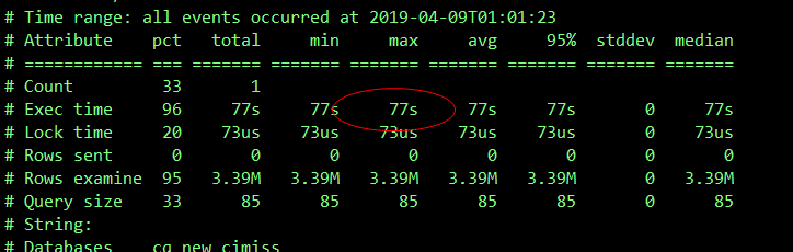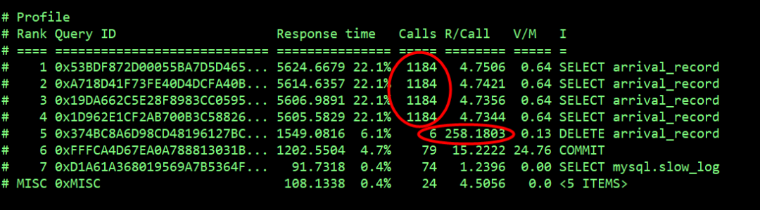 大多数慢查询都集中在 select arrival_record 操作上,平均响应时间为 4s,delete arrival_record 记录了 6 次,平均响应时间 258s。最多扫描的行数为 5600 万、平均扫描的行数为 172 万,推断由于扫描的行数多导致的执行时间长。