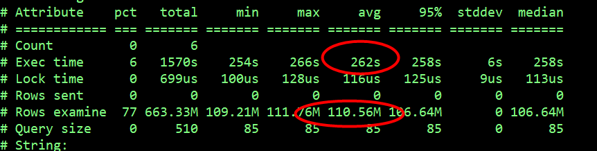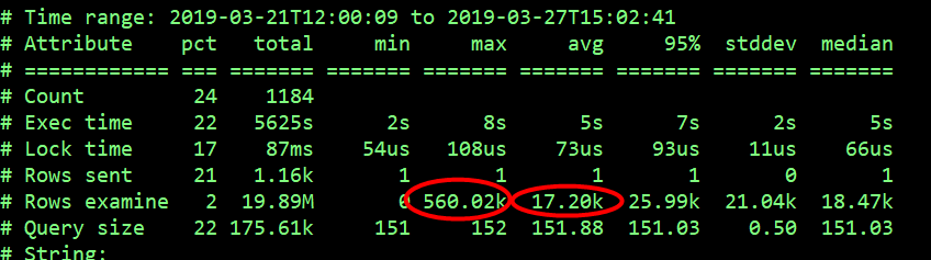 最近的一周时间里,所有记录的慢查询总共消耗了 25403s,其中,执行时间最长的 SQL 耗时 266s,平均每个慢 SQL 执行时间 5s,平均扫描的行数为 1766 万。