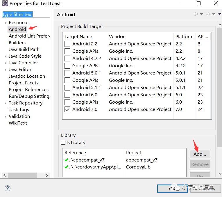 2.完成之后找到项目目录下platforms\android。可以看到下面有一个CordovaLib文件夹,打开之后你会发现其实它就是一个Android项目。将该项目导入Eclipse,然后再在我们原来的TestToast项目里面添加依赖该项目。TestToast项目右键->properties->Android->add。完成后如下所示
