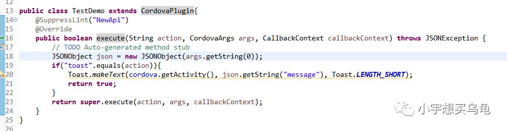 3.添加完成后在src目录下新建一个TestDemo.java类,继承CordovaPlugin。注意,我们写的所有插件都要继承CordovaPlugin。然后重写execute方法。在方法里面写要操作的原生代码。