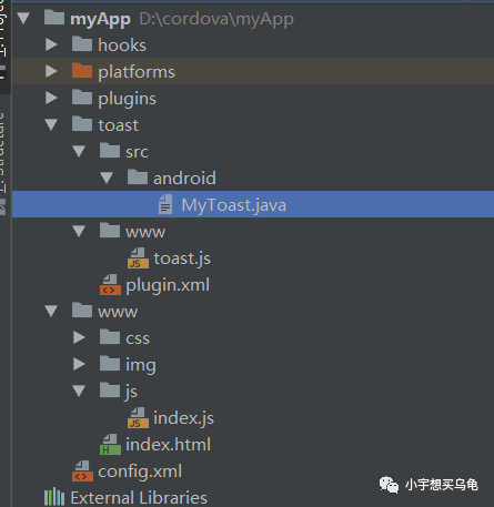 插件魔板生成成功后,我们开始配置cordova插件内容。前期我们已经新建了一个cordova项目,用webstrom打开,然后复制刚刚创建的插件到这个目录下。第一步,将之前在Android工程中写的MyToast.java文件复制到插件的android目录下。由于这里只用到了一个Toast。其他包括布局啊,什么的都用不到,所以就只有一个.java文件,如果有用到布局啊,外部jar包之类的话,还需要将其统统都拷贝到android目录下。