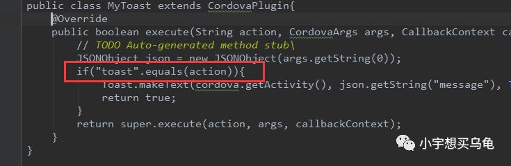 第一行是固定格式,照着写就行了。第二行中的toast为前台调用时候的方法名。解释一下exec();方法