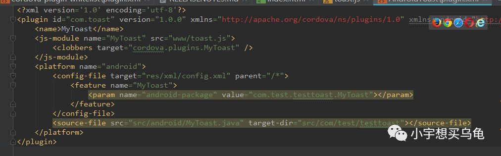 有人可能会问,为什么是cordova.plugins.MyToast.toast。而不是其他的方式。如果刚刚你细心一点的话,就会发现。cordova.plugins.MyToast这串字符,其实也就是刚刚的plugin.xml里面配置的