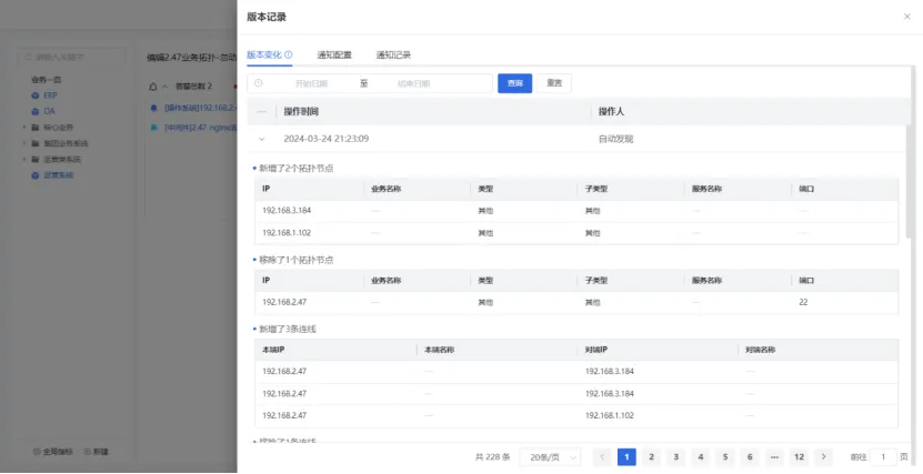 业务版本用于记录业务拓扑的变更行为。用户可以跟踪和管理业务结构的完整变更过程(谁变更,变更什么,何时变更,即3W),可配置变更提醒,同步通知到组员或相关负责人,有助于提高变更管理的透明度和控制能力。