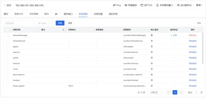 新增应用进程监控。此功能支持对操作系统上的应用进程、服务端口进行单独监控,当某些进程断开后实现自动报警。