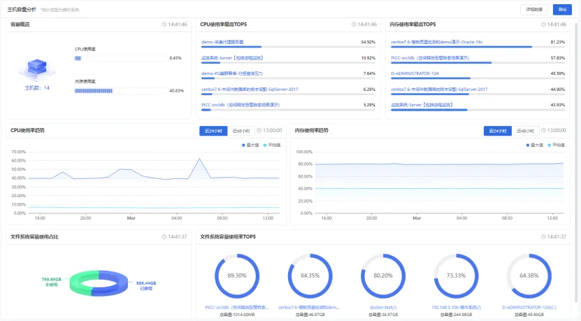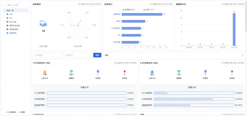 乐维监控7.0版本将业务容量、业务树整合至业务拓扑中,形成新的【业务管理】模块。经优化后,新的业务主机容量分析支持查看当前主机数量、总体CPU使用率、总体内存使用率,并可逐层下钻到具体指标。