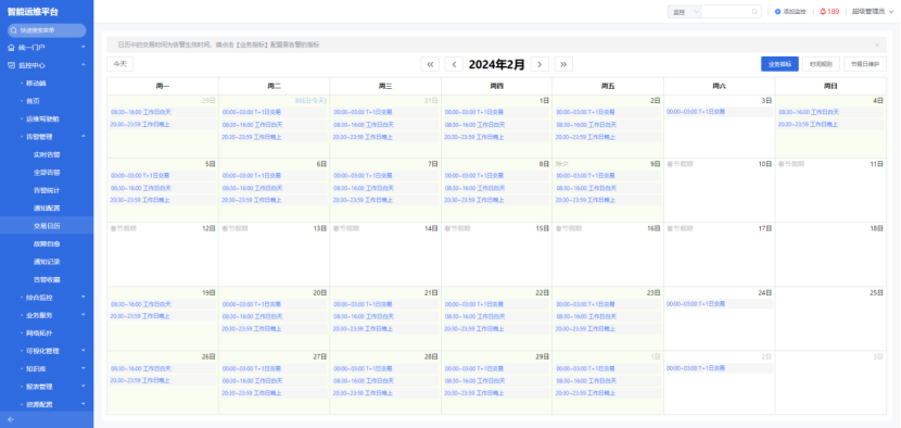 告警日历面向业务具有强周期性变化的行业领域,如证券、期货等,这类型企业展业期间,如证券、期货交易期间,交易系统会产生大量的交易数据并伴随着高并发的情况,在歇业期间,交易系统仅有少量底层模块维持基础运行状态。